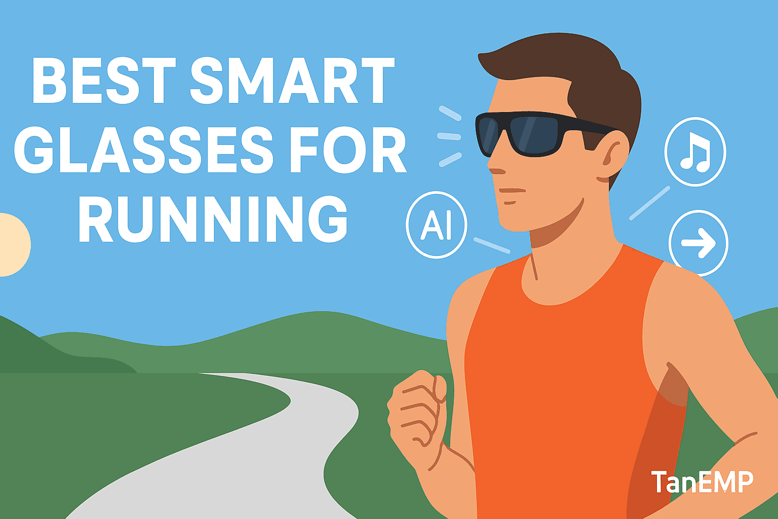 Flat-style illustration of a runner wearing futuristic smart glasses with icons for music, navigation, and AI features. Text reads ‘Best Smart Glasses for Running’ with TanEMP in the corner.
